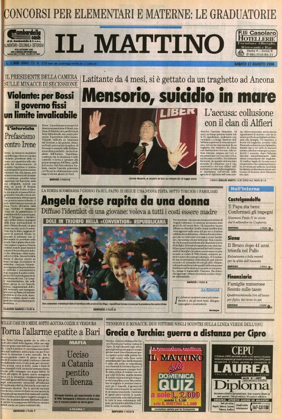 LA FUGA – L’ex senatore è in fuga: i giornali si sbizzarriscono. Mensorio è un ràs, un boss (metaforicamente parlando) del nolano, “padre-padrone” dell’Isef di cui era stato a lungo presidente e che avrebbe gestito da sovrano assolutista. Gli inquirenti avevano scoperto che ha conosciuto Alfieri e Galasso. “Alfieri? Certo che lo conosco. Saviano non è New York. Galasso? È stato mio allievo all’Università. E allora?”, aveva ribattuto lui. Spunta anche una loschissima cena al ristorante La Posada. Infine si convince: il 25 agosto del 1996 sale sul traghetto Superfast: 19 ore da Patrasso ad Ancona.