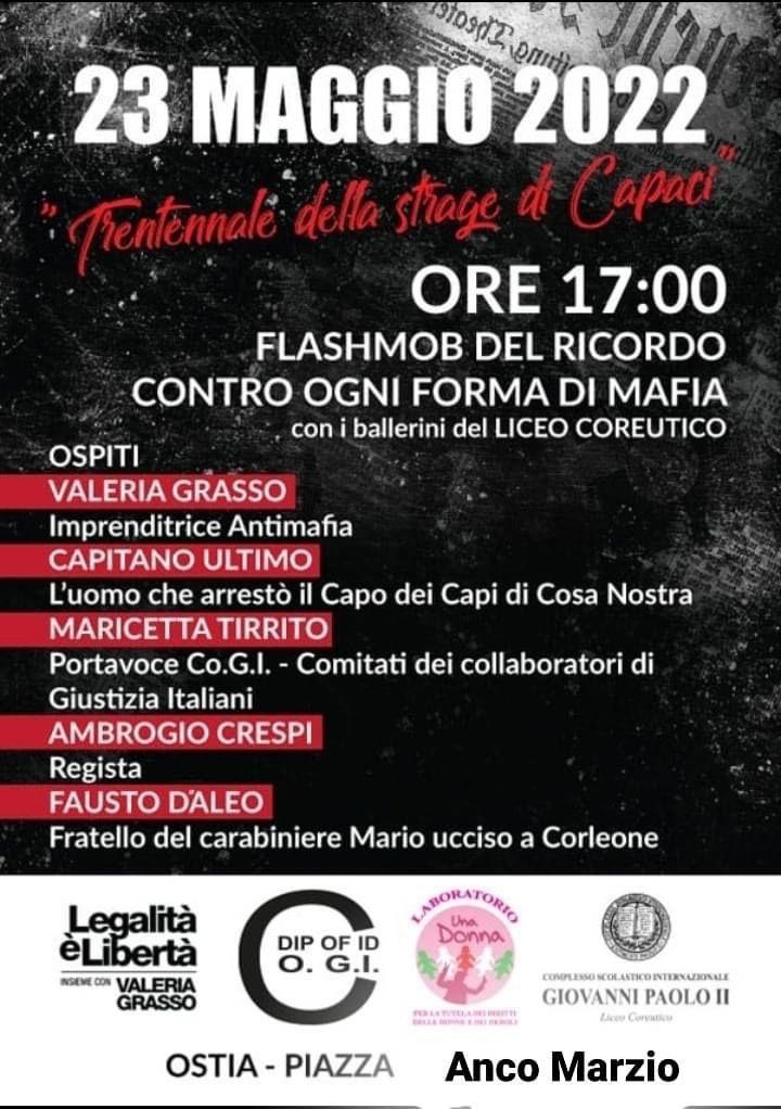 “Legalità, libertà e giustizia… questi devono essere i principi fondanti di una società e di uno Stato come il nostro. Valori per cui hanno lottato a testa alta tutte le vittime di mafia: chi è stato privato brutalmente della propria vita perché ha detto “no” e non ha abbassato mai la testa, facendo qualcosa di concreto contro la criminalità organizzata ed opponendosi fermamente ad ogni tipo di ingiustizia, minaccia o sopruso. E’ in loro memoria che, in occasione del trentennale delle stragi di Capaci e via D’Amelio, in piazza Anco Marzio ad Ostia, LUNEDÌ 23 maggio alle ore 17, con i ballerini del Liceo Coreutico Giovanni Paolo II faremo un flash mob del ricordo contro ogni tipo di mafia”.