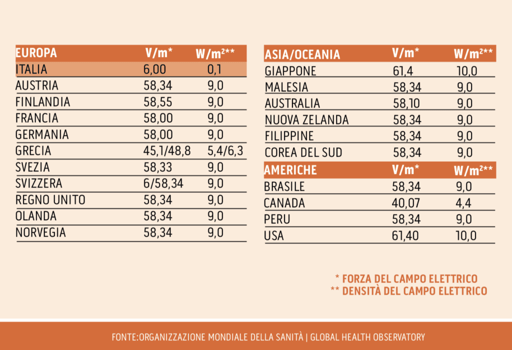 In sede istruttoria il governo aveva valutato un limite intorno ai 24 volt per metro, che è una media fra i limiti adottati nei Paesi europei (e comunque il quadruplo rispetto all’attuale). Il valore raccomandato dall’Unione europea è di 61 v/m (indicato dalla Raccomandazione del Consiglio europeo 519 del 1999). Quello stabilito in Italia con la legge quadro 36 del 2001 e il Dpcm dell’8 luglio del 2003 è molto più restrittivo, appena 6 v/m.