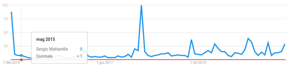 Secondo Google Trends, l’interesse del pubblico per il Presidente è stato nella fase iniziale del suo mandato e nel 2018 come già ampiamente riportato. Sicuramente è stato maggiore rispetto al Quirinale ed è curioso notare come l’Abruzzo sia la regione che ha cercato di più su Internet Mattarella, mentre la ricerca più frequente è stata “discorso di Mattarella”, riferito al messaggio di fine anno.