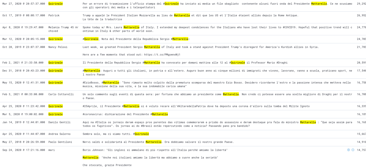 All’interno di questo schema, la parola Mattarella è comparsa in 1.412.660 tweets mentre Quirinale 654.203.