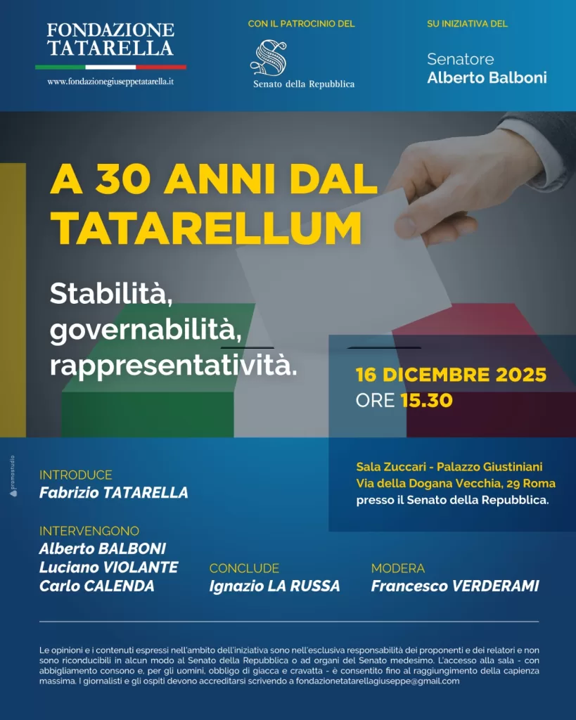 A 30 anni dalla legge elettorale regionale, martedì 16 dicembre 2025 alle ore 15.30 nella Sala Zuccari di Palazzo Giustiniani, sede della presidenza del Senato, la Fondazione Tatarella promuove il convegno: “A 30 anni dal Tatarellum: stabilità, governabilità, rappresentatività”. L’evento, con il patrocinio del Senato della Repubblica, sarà introdotto Fabrizio Tatarella, Vicepresidente della Fondazione e vedrà la partecipazione del Senatore Alberto Balboni, Senatore Fratelli d’Italia, Presidente della Commissione Affari costituzionali, Luciano Violante, Presidente Emerito della Camera dei deputati e del Senatore Carlo Calenda, leader di Azione.