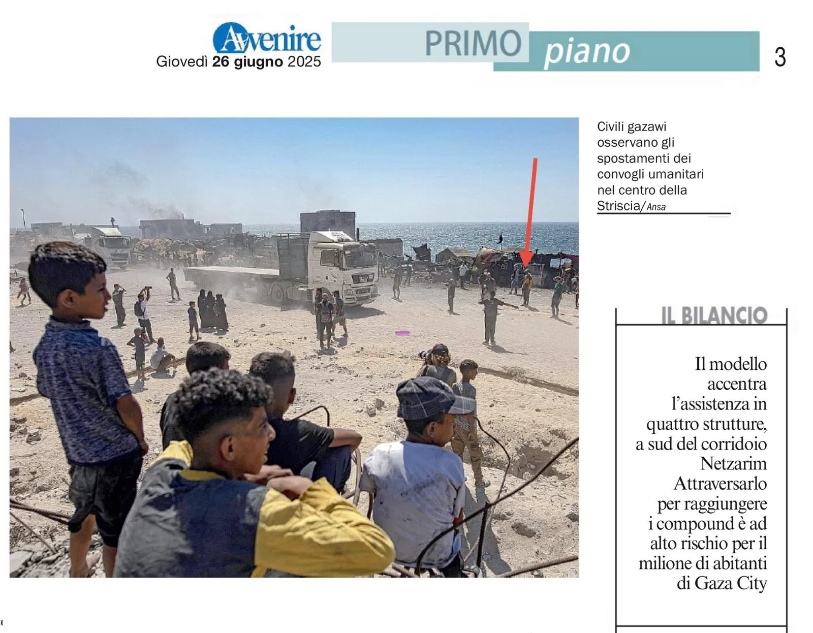 Dal punto di vista dell’agenzia che l’ha pubblicata, infatti, e da cui è possibile trarla (LUSA – Agéncia de Noticias de Portugal), quella foto ritrae semmai “i clan palestinesi che assicurano l’ingresso delle organizzazioni umanitarie a Gaza City”. E, porca miseria, pare che lì davanti al camion ci sia pure un civile un po’ armato: cosa che, fosse vera, sarebbe un po’ strana se si trattasse dei civili che osservano eccetera eccetera, ma assai poco strana se si trattasse dei clan palestinesi di cui parla la fonte fotografica inopinatamente non citata da Avvenire.