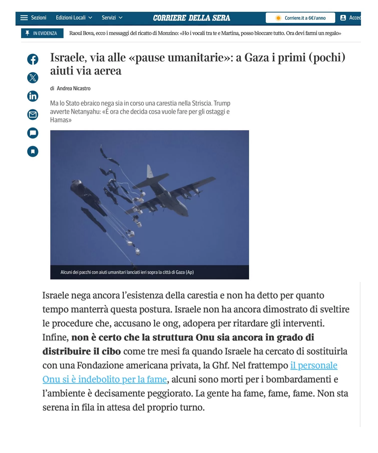 L’altro giorno il Corriere della Sera pubblicava la notizia falsa secondo cui a Gaza sarebbero entrati, nelle ultime settimane, 18 camion di aiuti al giorno (ne sono entrati 100 in media). Successivamente – forse nel tentativo maldestro di mettere una patacca correttiva a quella notizia inveritiera, forse invece per disinvolta trascuratezza – il Corriere scriveva che ne entravano 69. Cioè il Corriere riusciva nel capolavoro di sbugiardare sé stesso, ma lasciandosi andare a una bugia di secondo livello – una specie di fake news light – che inguattava 30 camion.