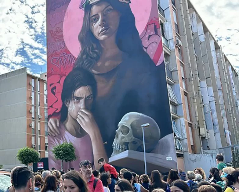 Questo quartiere confina con la Brancaccio di Padre Puglisi e dei Graviano, e Acqua dei Corsari, nomi noti che nulla hanno di rassicurante per coloro che Palermo la conoscono dalle cronache dei giornali, e nemmeno per gli stessi palermitani borghesi. La borghesia è venuta allo Sperone, ha presenziato, come si dice in questi casi: c’era il sindaco Lagalla, l’assessore alla Cultura Cannella, ma le protagoniste erano loro, le donne del quartiere, che già sono riuscite a lottare contro la disperazione sottoforma di dispersione scolastica. Sono riuscite al suono della campanella, con lo stimolo di operatori da nominare tutti Cavalieri del lavoro, quello vero, civile, a riportare i figli in una scuola che era stata bruciata e abbandonata. Hanno sfilato qualche settimana fa, nell’ambito dei progetti di comunità nell’anno della 400esima festa per la liberazione dalla peste per opera della Santa Patrona. Hanno sfilato su un carro, davanti a un murales di Giulio Rosk che raffigura due Rosalie: una iconica nel suo sguardo rassicurante, e l’altra col volto di bambina, infastidita, che si tura il naso davanti al degrado della nuova peste che dilaga in città. La droga.