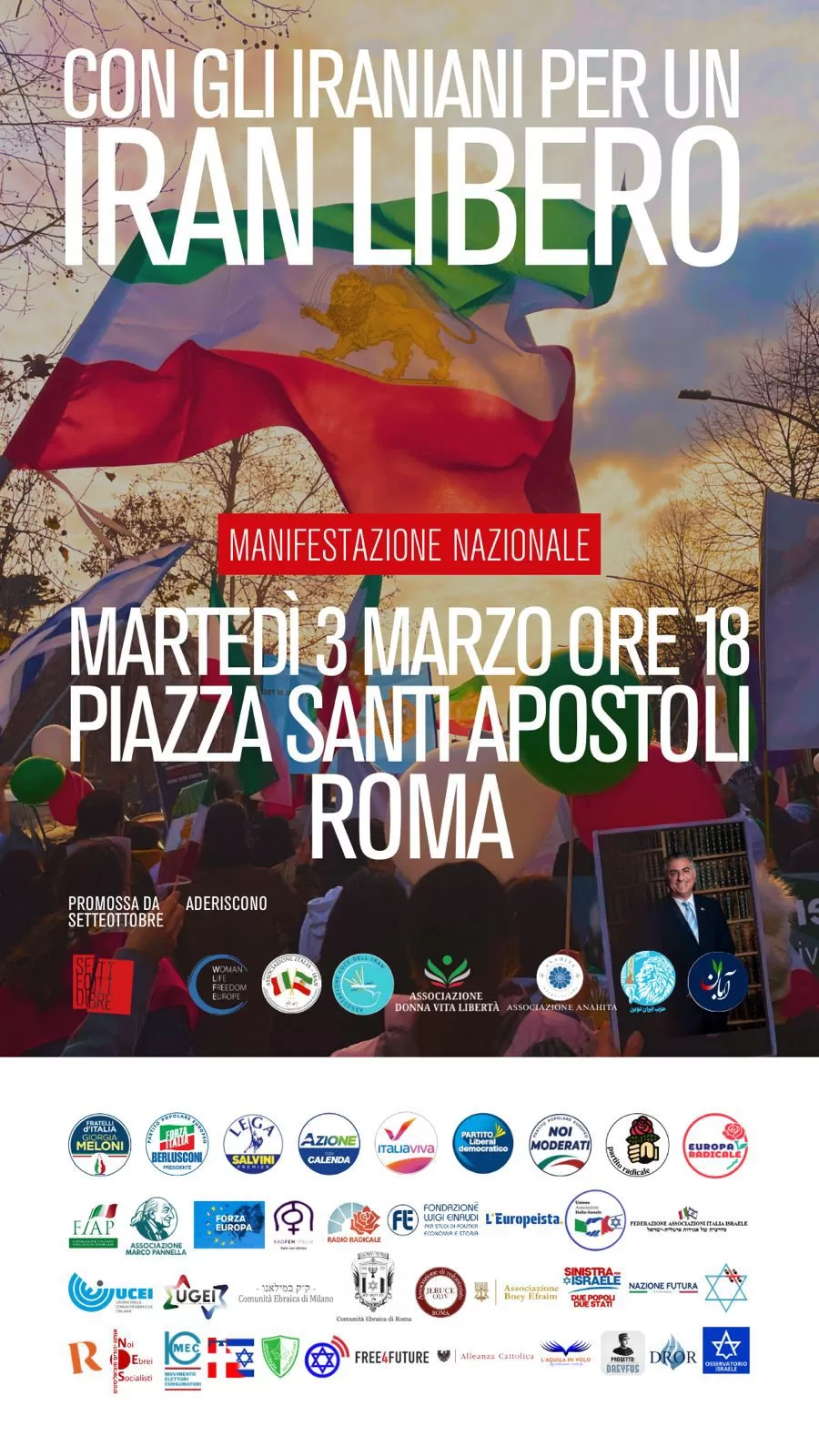 Il Riformista, media partner dell’evento, ci sarà. Stefano Parisi, che aprirà la manifestazione, rivolgerà un plauso a «USA e Israele che non hanno lasciato gli iraniani soli. Ci auguriamo che i governi europei si uniscano alla coalizione per rovesciare il regime sanguinario degli ayatollah». Azione ci sarà, con Ettore Rosato e Marco Lombardo, che dice: «Saremo sempre al fianco della comunità iraniana che vive in Italia e che guarda con apprensione a ciò che sta succedendo in Iran: dopo la morte di Khomeini non basta un cambio al regime.