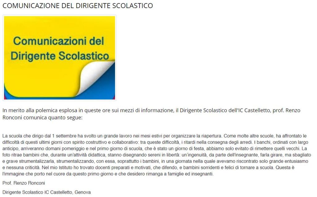 Anche per questo arriva quindi la puntualizzazione di Renzo Ronconi, dirigente scolastico dell’Istituto Comprensivo Castelletto. In una nota ufficiale Ronconi scrive che la scuola, “come molte altre, ha affrontato le difficoltà di questi ultimi giorni con spirito costruttivo e collaborativo: tra queste difficoltà, i ritardi nella consegna degli arredi. I banchi, ordinati con largo anticipo, arriveranno domani pomeriggio (oggi per chi legge, ndr) e nel primo giorno di scuola, che è stato un giorno di festa, abbiamo solo evitato di rimettere quelli vecchi. La foto ritrae bambini che, durante un’attività didattica, stanno disegnando sereni in libertà: un’ingenuità, da parte dell’insegnante, farla girare, ma sbagliato e grave strumentalizzarla, strumentalizzando, con essa, soprattutto i bambini, in una giornata nella quale avevamo riscontrato solo grande entusiasmo e nessuna criticità. Nel mio Istituto ho trovato docenti preparati e motivati, che difendo, e bambini sorridenti e felici di tornare a scuola. Questa è l’immagine che porto nel cuore da questo primo giorno e che desidero rimanga a famiglie ed insegnanti”.