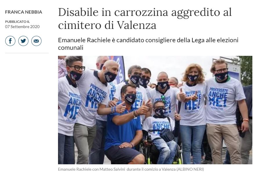 Da vittima di una aggressione da parte di un “uomo di colore” a denunciato per simulazione di reato. È la storia che vede protagonista Emanuele Rachiele, 19enne disabile candidato a Valenza (Alessandria) alle elezioni comunali in lista con la Lega.