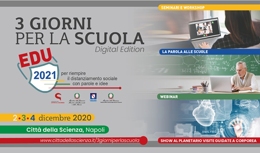 Dal 2 al 4 dicembre si terrà la Tre Giorni per la Scuola Edu 2021, il principale evento nazionale sui temi della didattica scolastica promosso dalla Regione Campania e da Città della Scienza in collaborazione con la Direzione dell’Ufficio Scolastico Regionale per la Campania.