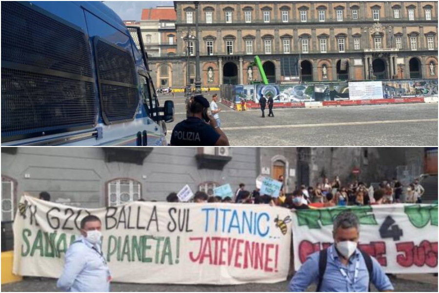 Già ieri è iniziata la movimentazione con la passeggiata in bici di Potere al Popolo e la violazione simbolica della zona rossada parte di una cinquantina di attivisti della rete “Bees against G20”: hanno oltrepassato le transenne in piazza Plebiscito e posizionato lo striscione “Il G20 balla sul Titanic. Salviamo il pianeta, jatevenne”.