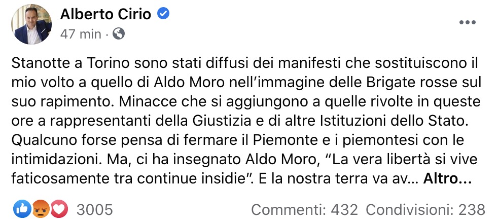 Sulla vicenda indaga ora la polizia, mentre il governatore su Facebook non si è lasciato intimidire: “Qualcuno forse pensa di fermare il Piemonte e i piemontesi con le intimidazioni. Ma, ci ha insegnato Aldo Moro, “La vera libertà si vive faticosamente tra continue insidie”. E la nostra terra va avanti”, ha scritto Cirio.