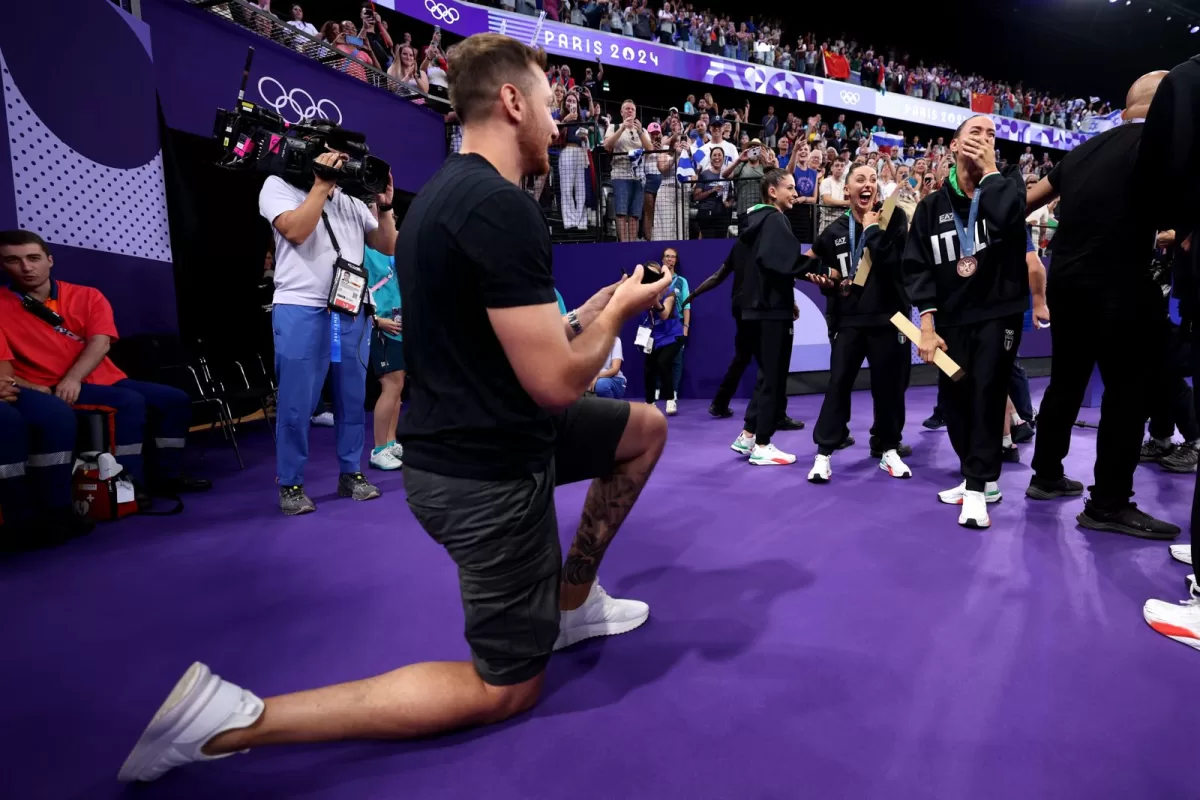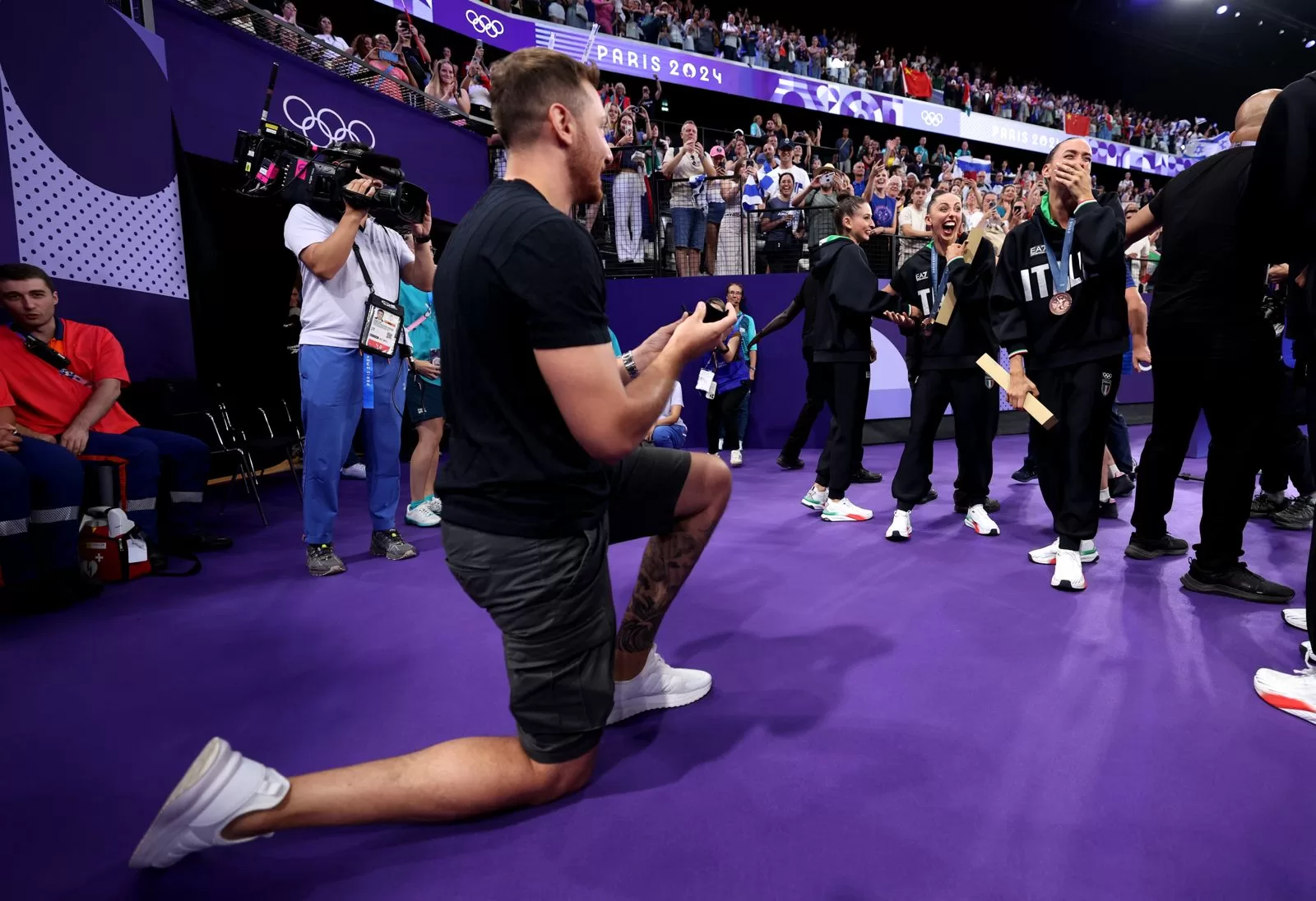 “Ma che sei matto“. Sono le prima parole di Alessia Maurelli, capitana delle farfalle (Martina Centofanti, Agnese Duranti, Daniela Mogurean e Laura Paris) che hanno appena conquistato il bronzo alle Olimpiadi di Parigi nella gara a squadre della ginnastica ritmica, che poco dopo essere scesa dal podio per la premiazione insieme alle atlete cinesi (medaglia d’oro) e israeliane (argento), si ritrova il fidanzato Massimo Bertelloni, professione attore, che l’abbraccia e poi si inginocchia tra lo stupore e gli applausi dei presenti e del pubblico sugli spalti.