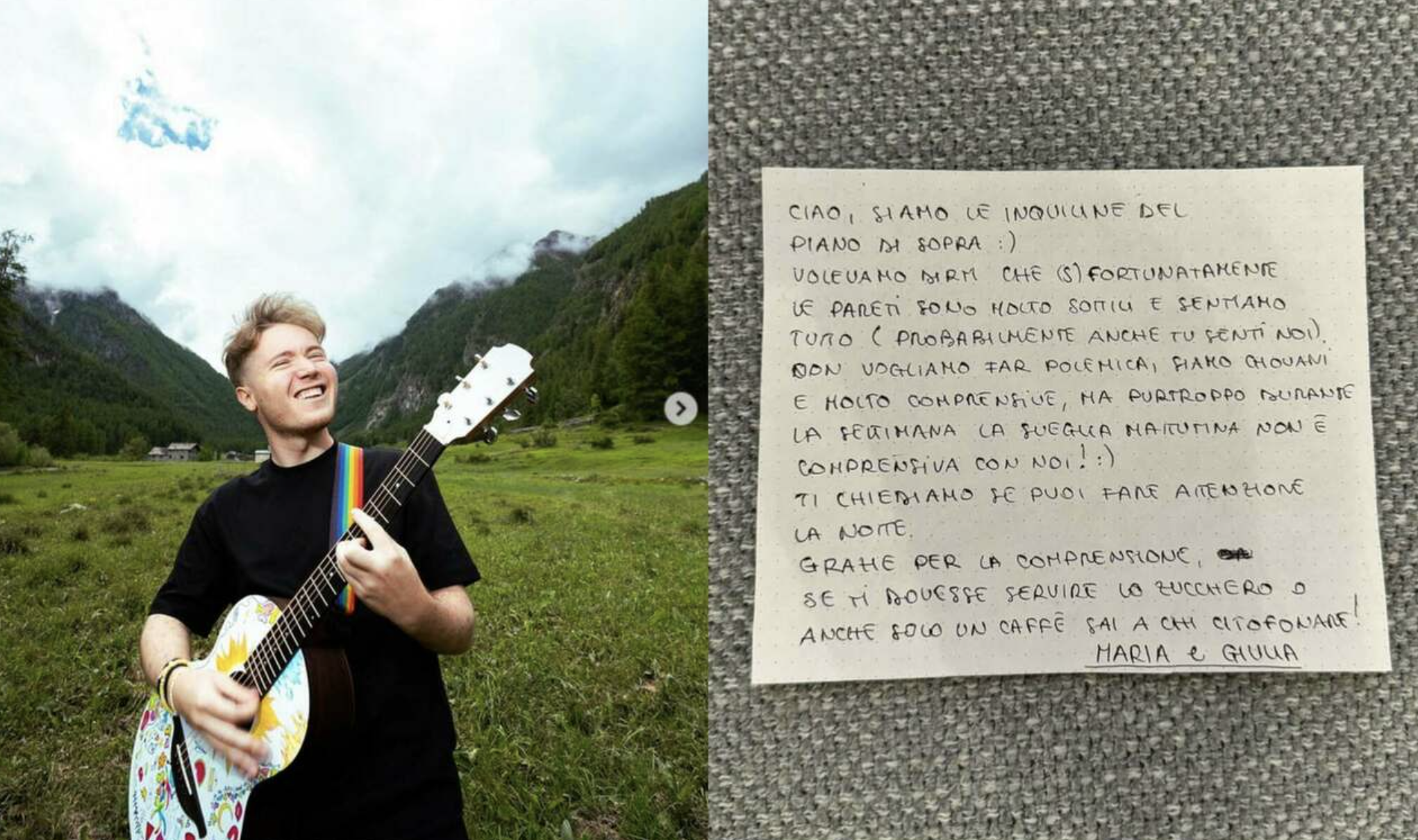 “Siamo le inquiline del piano di sopra”, si presentano le due ragazze aggiungendo che “(s)fortunatamente il solaio è molto sottile”, e che dal loro appartamento “si sente tutto”. Un bigliettino che Alfa ha pubblicato su Instagram: “Non vogliamo polemizzare – continuano – siamo giovani anche noi e molto comprensive, ma purtroppo durante la settimana la sveglia non lo è altrettanto con noi”. Gli impegni mattutini delle due ragazze non coincidono evidentemente col momento di massima ispirazione del cantante, che predilige suonare di sera tardi.