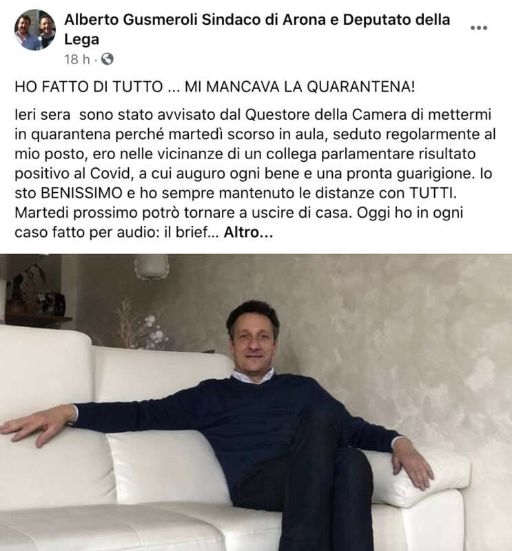 A confermare la vicenda lo stesso deputato della Lega Alberto Gusmeroli, sindaco di Arona, che ha spiegato su Facebook le voci che stavano rimbalzando sul caso di positività al Covid-19 tra le fila del Carroccio. “Ho fatto di tutto, mi mancava la quarantena. Ieri sera sono stato avvisato dal Questore della Camera di mettermi in quarantena perché martedì scorso in aula, seduto regolarmente al mio posto, ero nelle vicinanze di un collega parlamentare risultato positivo al Covid, a cui auguro ogni bene e una pronta guarigione. Io sto benissimo e ho sempre mantenuto le distanze con tutti. Martedì prossimo potrò tornare a uscire di casa”, ha scritto su Facebook Gusmeroli.