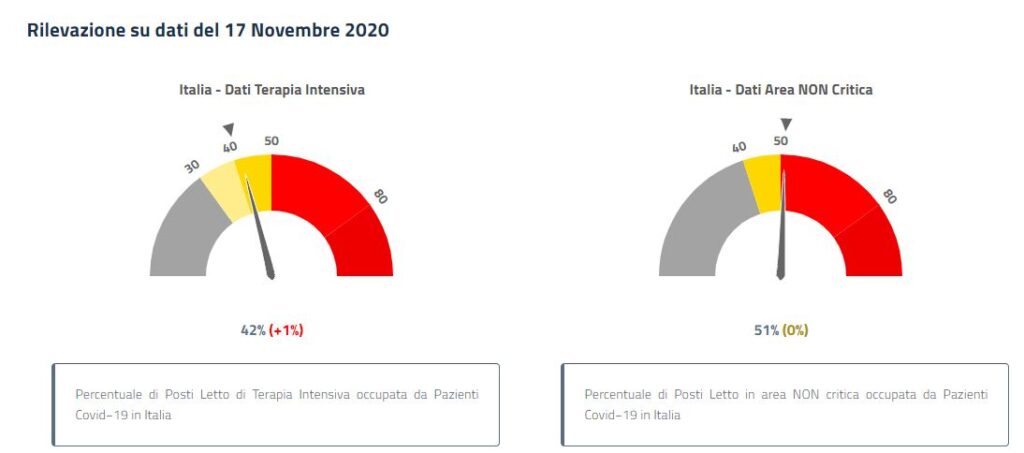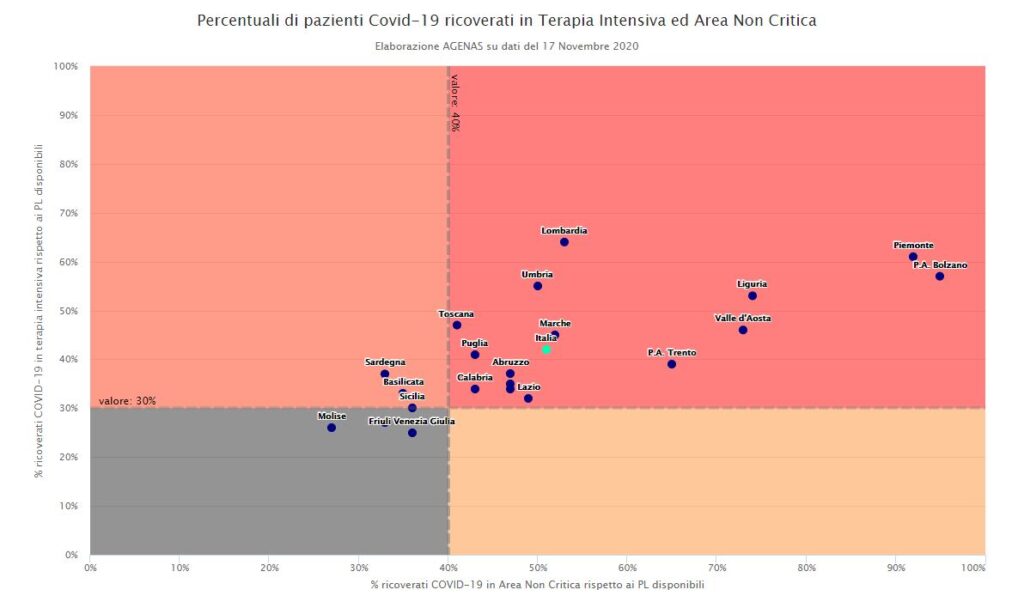I pazienti Covid occupano il 42% dei posti di terapia intensiva disponibili e attivi in Italia, ovvero il 12% oltre la soglia critica del 30%. Lo rivela il monitoraggio dell’Agenas, l’Agenzia per i servizi sanitari regionali, aggiornato al 17 novembre. Una situazione sempre più critica nel Paese: l’allarme sforamento riguarda ora 17 regioni su 21, mentre soltanto una settimana fa erano dieci. In testa la Lombardia con il 64% dei ricoverati Covid in terapia intensiva rispetto ai posti disponibili, seguita dal Piemonte con il 61% e dalla provincia di Bolzano con il 57%.