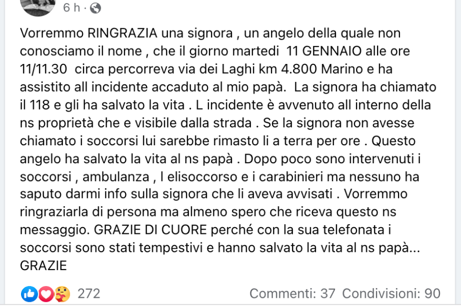 “Vorremmo ringraziare una signora, un angelo della quale non conosciamo il nome, che il giorno martedì 11 gennaio alle ore 11/11.30 circa percorreva via dei Laghi km 4.800 Marino e ha assistito all’incidente accaduto al mio papà” si legge sul post pubblicato sul gruppo ‘Frascati e Castelli Romani’. “La signora ha chiamato il 118 e gli ha salvato la vita. L incidente è avvenuto all interno della nostra proprietà che è visibile dalla strada. Se la signora non avesse chiamato i soccorsi lui sarebbe rimasto lì a terra per ore. Questo angelo ha salvato la vita al nostro papà.”