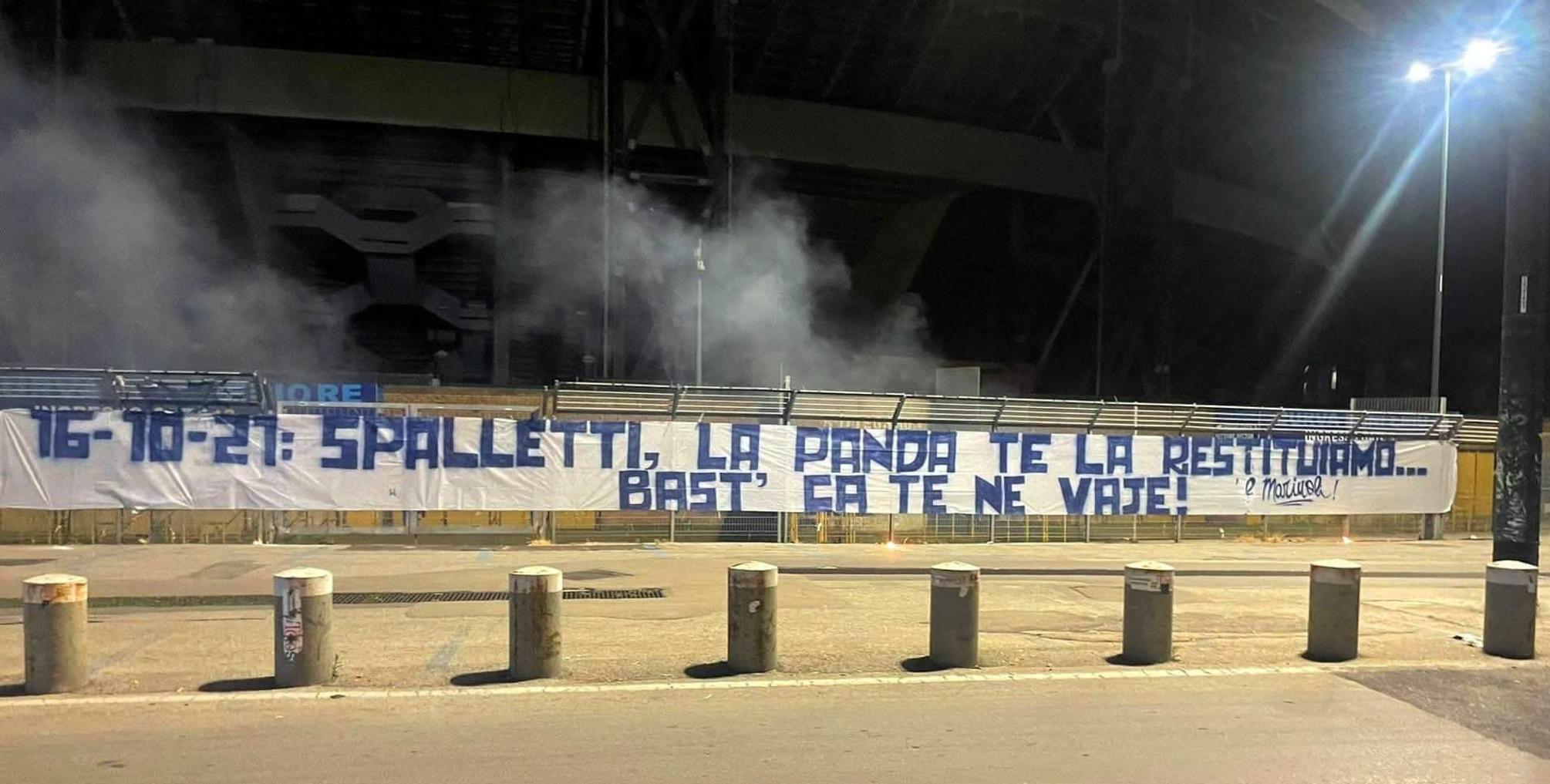 Nella tarda serata uno striscione dalle dure parole è comparso all’esterno dello stadio Diego Armando Maradona di Napoli. “16-10-21: Spalletti, la Panda te la restituiamo, basta che te ne vai”. Questo il testo, per metà scritto in dialett. Lo striscione è firmato “‘E mariuol”, “i ladri”, e il riferimento è all’auto rubata all’allenatore del Napoli Luciano Spalletti lo scorso 16 ottobre.