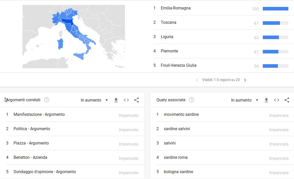 Ad oggi, il gruppo di Mattia Santori ha fatto breccia più al Nord, con Emilia Romagna in testa per i motivi elettorali di fine gennaio 2020, mentre al Sud sono già scoppiate le prime manifestazioni avverse al movimento che comunque continua a crescere nel numero di proseliti. Gli argomenti più cercati sono manifestazione politica, ma anche Benetton su cui pende un passo falso di Santori abilmente trasformato in passo indietro. Non manca tra le query, ricerche, il binomio Sardine Salvini.
