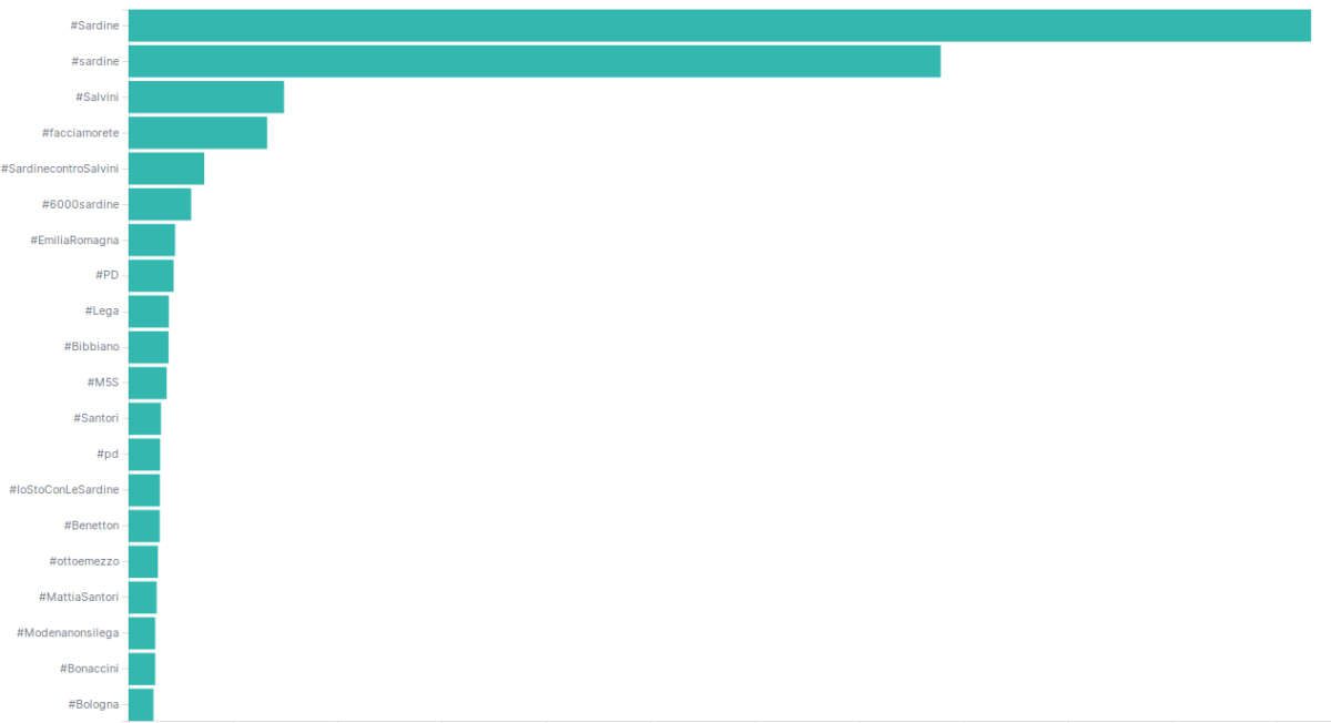 Gli argomenti più utilizzati per promuovere la loro attività in giro per l’Italia fatta di manifestazioni in piazza con concerti faraonici sono stati: #Sardine, il loro, #Salvini, il nemico giurato, #sardinecontrosalvini e riferimenti al #PD ed alle elzioni in Emilia con #bonaccini #bologna e #bibbiano in testa.