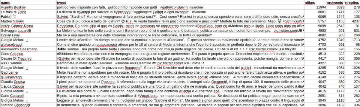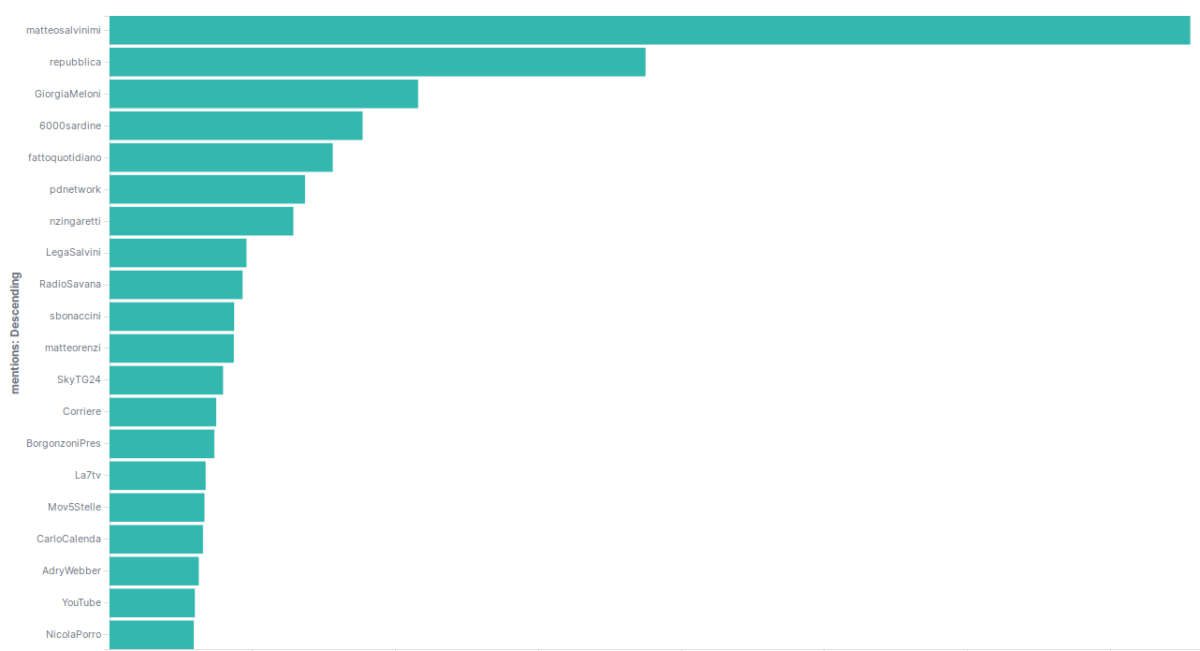Tra le menzioni principali figurano ovviamente Salvini in testa e La Repubblica, che con l’edizione bolognese ha caldeggiato tutte le attività sul territorio del gruppo di Santori. Segue Giorgia Meloni che chiude il podio rimandando al 4 posto le Sardine stesse. Più che attrattori, il successo del movimento nasce proprio dalle citazioni avute sia dagli alleati che dai nemici politici giurati.
