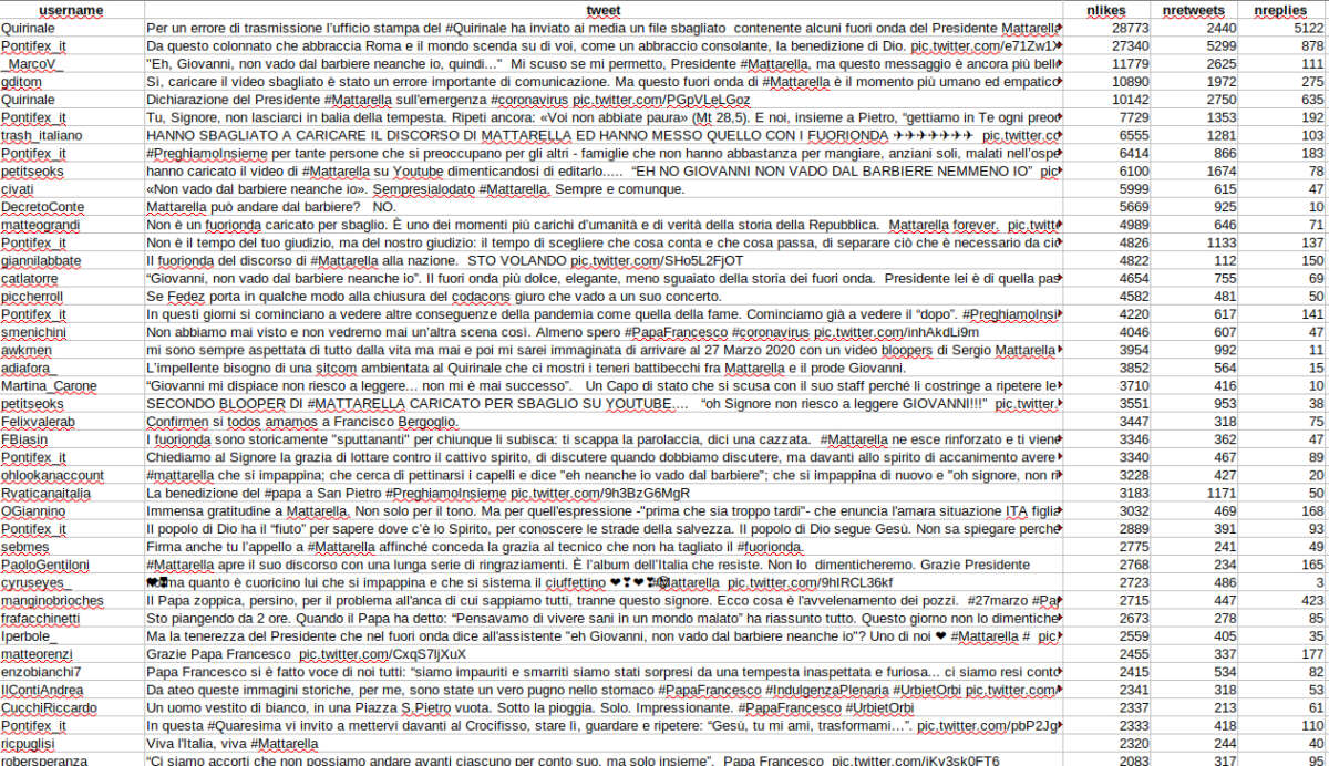 Mentre Bergoglio ha lanciato una benedizione urbi et orbi che è stata condivisa anche nel mondo non visibile delle app di messaggistica, Mattarella ha invaso il campo dei social media con un fuori onda inaspettato dove si scusa con l’operatore per il taglio non proprio eccelso visto il periodo di chiusura dei barbieri. Ed il popolo del web è andato in delirio, come rilevato dall’analisi del data journalist Livio Varriale.