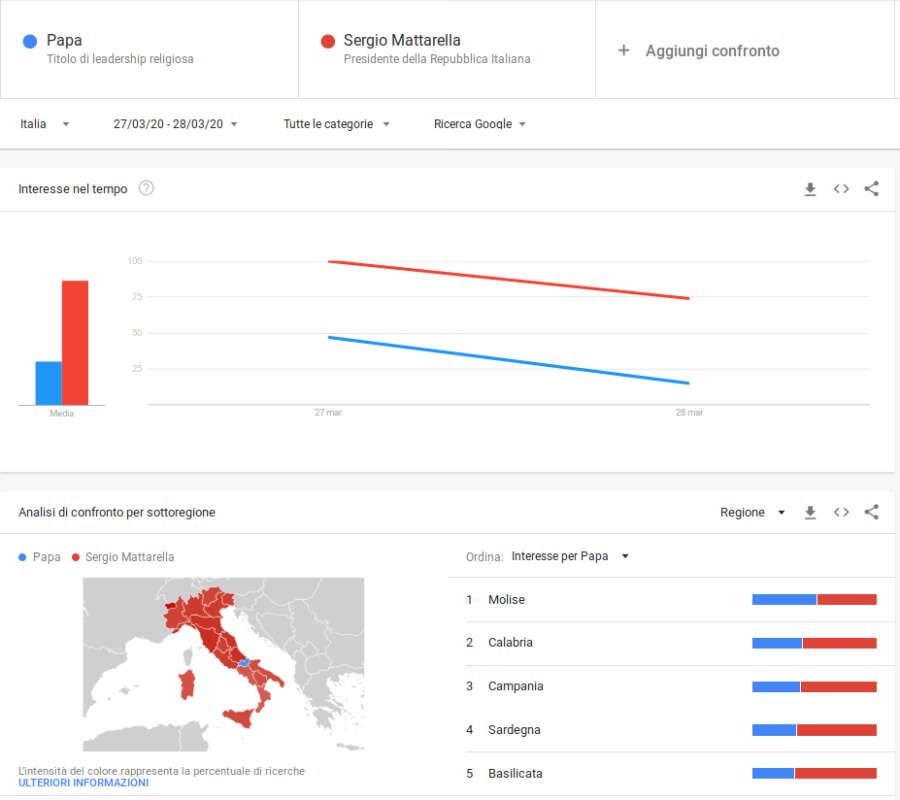 I dati di Google Trends parlano chiaro, il vincitore è Mattarella che in tutte le regioni spopola nelle ricerche del motore di ricerca, salvo in Molise. Il fuorionda presidenziale, pacato nella sua forma, ha rappresentato una novità nel mondo della comunicazione istituzionale ed ha superato l’imponente, ma prevedibile ed annunciata, immagine di un Papa isolato nella splendida ed immensa piazza San Pietro.