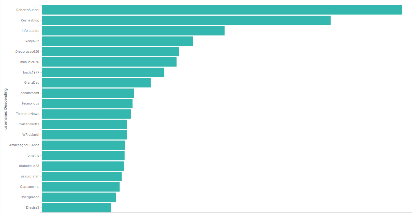 Se partiamo dagli utenti singolarmente, ci accorgiamo che Burioni stacca tutti dal punto di vista delle pubblicazioni con più di 1000 tweet ed il 74.7% di copertura, segue Ricciardi con 17.6% che allunga sulla Capua ferma al 7.7% di penetrazione social tanto da non figurare nella top 20 degli utenti più attivi dove sono presenti nella parte alta della classifica @Keynesblog @infoitsalute @kenyaEin @diegorusso626.
