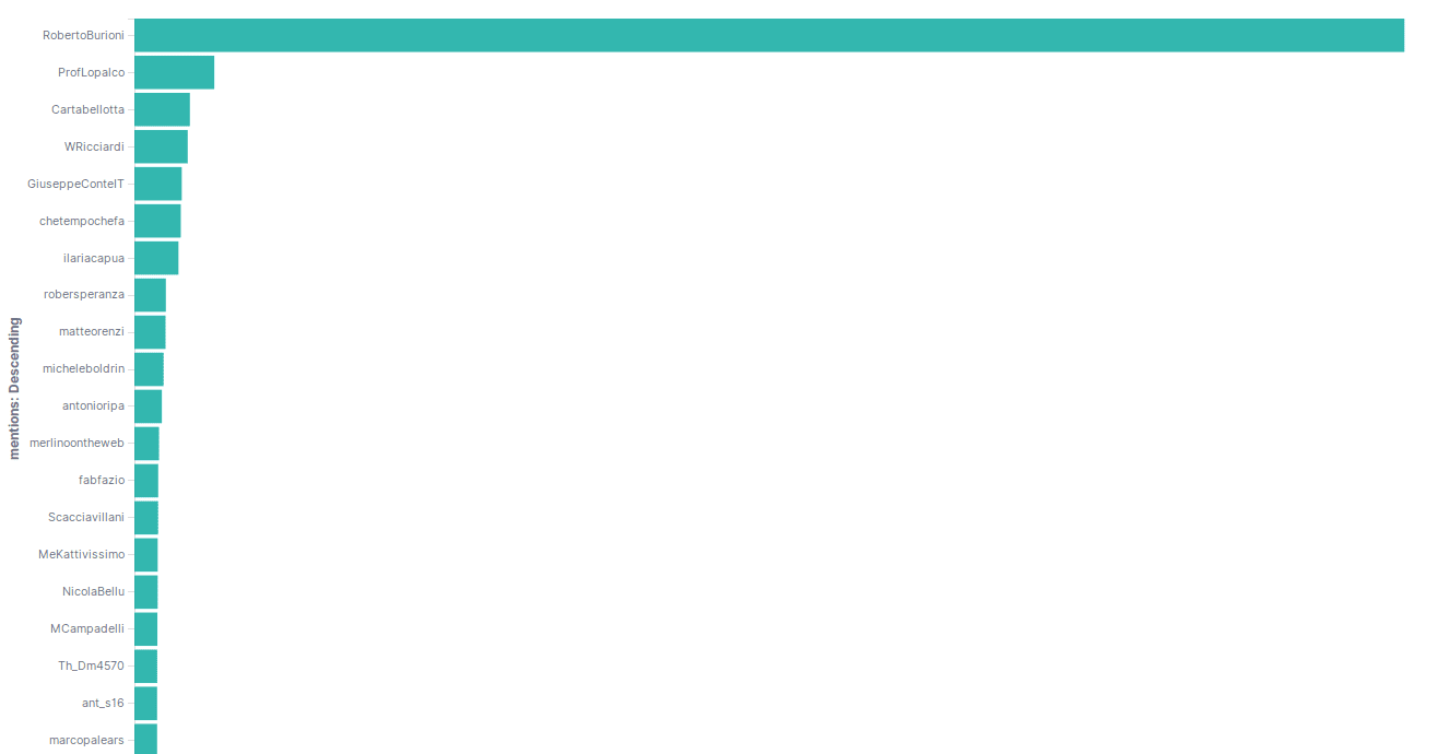 Nel round delle menzioni, Burioni è quello più citato, ma è chiaro il fattore non solo delle pubblicazioni, bensì anche della risonanza che che tempo che fa ha nel mondo social ed infatti sia Burioni che Che Tempo che fa sono sopra Ilaria Capua. Ricciardi mantiene la classifica stando nel mezzo. Un risultato scontato se consideriamo le proporzioni della presenza sui social da parte dei tre. Presenti in cima anche @ProfLopalco @Cartabellotta @GiuseppeConteIT