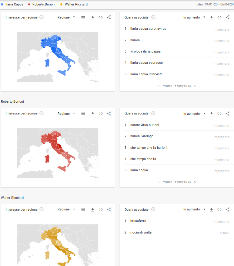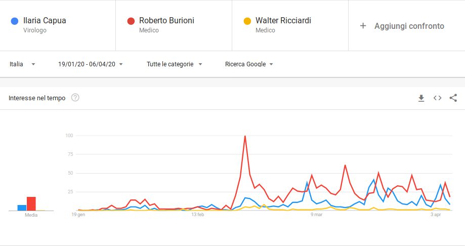 Discorso diverso nei trends di Google dove nessuno, o pochi cerca Ricciardi, mentre Capua e Burioni hanno indici di ricerca elevati che si intrecciano tra di loro. La sfida è aperta nonostante il medico del San Raffaele sia l’avversario da battere, ma quello che conferma la teoria che il rappresentante Pro-Vax non gioca da solo la partita della fama è chiaro nel dato specifico delle ricerche che segue.