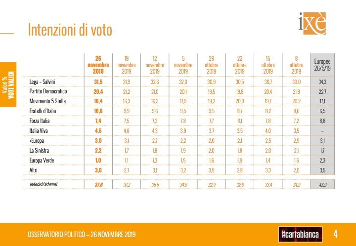 Lega in calo negli ultimi sondaggi politico elettorali. Infatti dopo la rilevazione di Swg per La7, anche secondo Ixè per Rai3 Cartabianca, il partito di Matteo Salvini starebbe perdendo alcuni punti percentuali. Sempre primo partito, la Lega si ferma al 31,5, perdendo lo 0,4%. Al secondo posto, in calo anche il Partito Democratico che totalizza il 20,4% delle preferenze, mentre è tendenzialmente stabile, rispetto all’ultima rilevazione, il Movimento 5Stelle con il 16,4% (+0,1%).