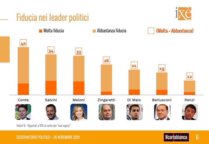 LA FIDUCIA NEI LEADER POLITICI – Il premier Giuseppe Conte ha una fiducia del 40% e risulta il più apprezzato dagli italiani. Lo seguono Matteo Salvini al 34% e Giorgia Meloni al 33%. Staccati Luca Zingaretti al 26%, Luigi Di Maio al 21%, Silvio Berlusconi al 19% e Matteo Renzi al 12%.