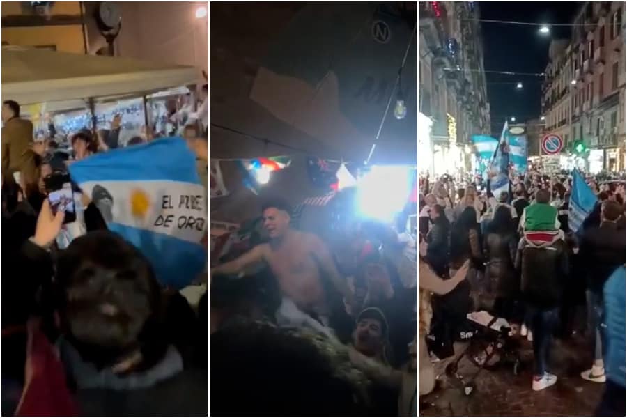 Tanta era la folla anche a Piazza Miraglia che qualcuno ha deciso di rinunciare alla visione sullo schermo collettivo e guardare la partita dallo schermo del cellulare o attraverso la radio ma restando lì, tra le magliette dell’argentina che si confondevano con quelle del Napoli e le scritte “Maradona” e “Pibe de Oro” che troneggiava. Nelle chat degli argentini, venuti a Napoli da ogni parte d’Italia, è circolata per tutto il giorno la notizia che a Castel dell’Ovo e allo Stadio Maradona ci sarebbero stati dei maxi schermi. Poi si sono dovuti accontentare di organizzazioni estemporanee o schermi nei dehors dei bar. Ma la festa è stata grande comunque.