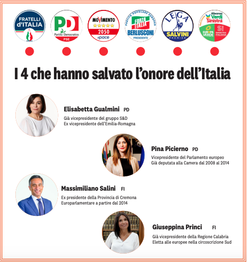 Una nuova versione di “pasta, pizza e mandolino” con una spruzzata di stop per l’Ucraina. Solo quattro gli eurodeputati italiani che votano a favore della revoca come i loro gruppi europei di appartenenza (Ppe e S&D): Massimiliano Salini e Giuseppina Princi di Forza Italia, la vicepresidente Pina Picierno ed Elisabetta Gualmini del Pd. Contrari tutti gli altri deputati europei eletti in Italia che finiscono in minoranza, l’aula approva infatti l’articolo con 377 voti a favore, 191 contrari e 51 astenuti.
