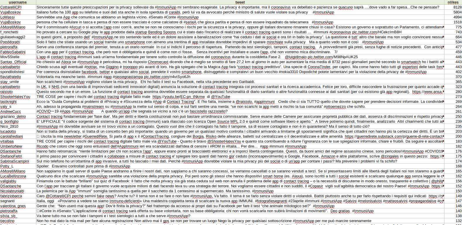 Risultato? Dopo pochi giorni il Ministero dell’Innovazione smentisce il lavoro della Commissione e fa diramare la notizia che l’app avrà un sistema di raccolta dati decentralizzato e quanto prima il codice sarà a disposizione della comunità informatica. E’ la prima volta che il popolo social, secondo quanto rilevato dal data journalist Livio Varriale, si scalda per una questione politica che scaturisce da una notizia prettamente tecnologica. La ricerca del sentiment sulla questione spinosa appena descritta ha raccolto dal 18 aprile 4,486 tweets che hanno riscosso un vortice di 49.405 likes, 12.390 retweets, 8.609 commenti.