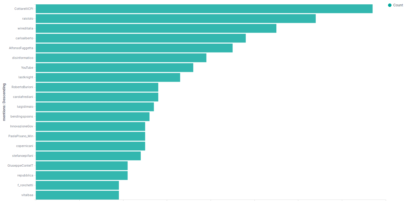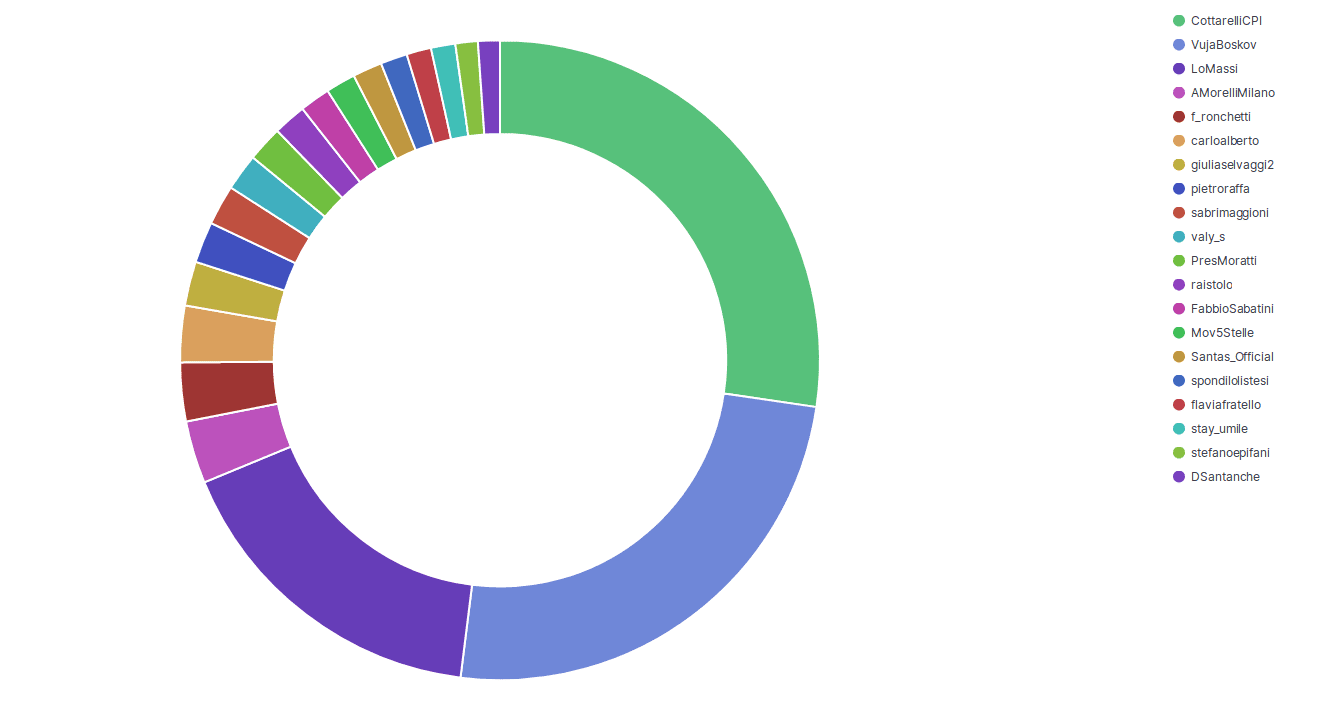 Per entrare nel merito delle discussioni che vanno oltre gli spot di influencer favorevoli e contrari, bisogna analizzare il dato delle menzioni. Ed è lì che emergono sotto la montagna Cottarelli, che ha generato 8.000 like con il suo tweet e più di mille commenti, Stefano Zanero docente del Politecnico e grande oppositore delle strategie di Governo, così come Wired Italia, premiata per i suoi approfondimenti sul tema, insieme a @carloalberto di Radio Capital. Chi però risulta terzo in classifica è il prof. Alfonso Fuggetta, membro della Commissione che ha scelto la società Bending Spoons come vincitrice di “concorso” e oggetto della maggior parte di critiche rivolte alla scelta dei 74. Presenti in classifica anche il debunker Paolo Attivissimo e Matteo Flora, compagno di avventura di Zanero nella lotta alla App così come è stata individuata dal Governo. Anche il Ministro degli Esteri Luigi Di Maio figura tra i soggetti più citati per via della sua gaffe, poca considerazione invece per il Ministero dell’Innovazione e la Ministra Paola Pisano spiazzati dal turbine di polemiche che ha portato il COPASIR ad intervenire sulla vicenda che ha assegnato alla Bending Spoons la gestione dei dati dei nostri spostamenti. @Stefanoepifani, invece, scavalca il premier Giuseppe Conte.