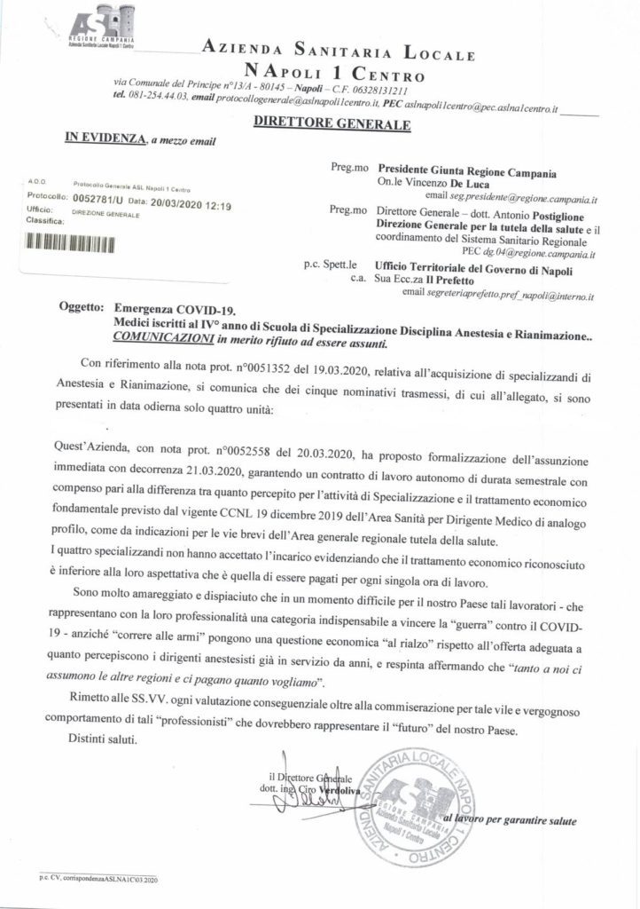 IL CASO – Anche la Campania non sta vivendo un bel momento in quanto, come già descritto dal governatore della Regione Vincenzo De Luca, gli operatori sanitari sono in minoranza rispetto all’emergenza che si sta fronteggiando esponendosi ad un grosso rischio di contagio. Nel nostro Paese finora sono 20 i medici morti per coronavirus e una ‘chiamata alle armi’ era doverosa. Per questo lo scorso 19 marzo con una nota l’Asl ha proposto formalizzazione dell’assunzione immediata con decorrenza dal giorno 21 marzo “garantendo un contratto di lavoro autonomo di durata semestrale con compenso pari alla differenza tra quanto percepito per l’attività di Specializzazione e il trattamento economico fondamentale previsto dall’attuale contratto collettivo di lavoro dell’Area Sanità per Dirigente Medico di analogo profilo”. Soltanto quattro specializzandi su cinque hanno raccolto la sfida per poi rifiutare dinanzi alla proposta economica esposta nel contratto. Questo comportamento non è stato particolarmente apprezzato dal direttore Verdoliva che ha inviato una comunicazione al veleno dell’Asl Napoli 1 Centro al presidente della Regione De Luca e al Prefetto di Napoli Marco Valentini.