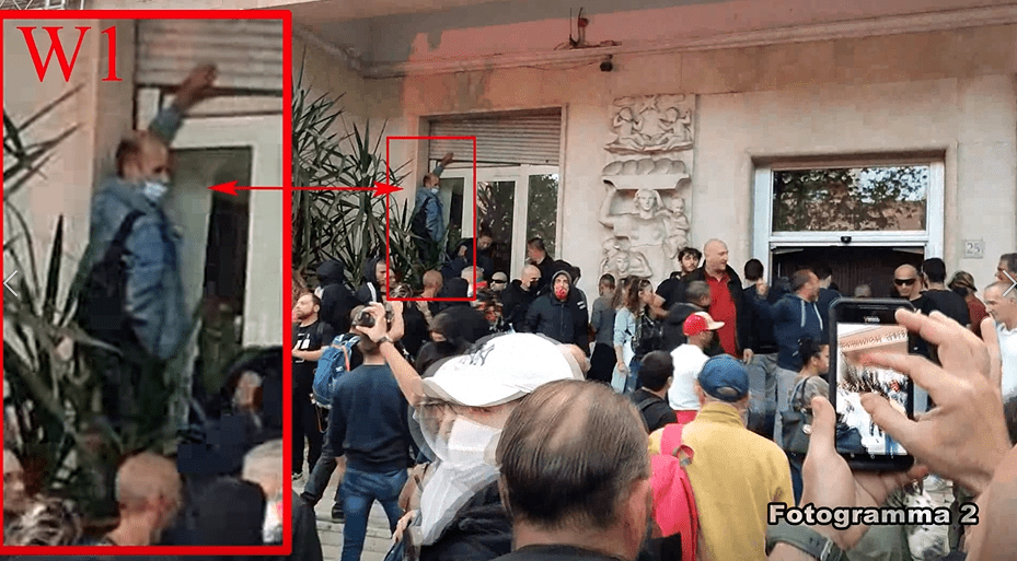 Nel filmato si vede un uomo calvo con una mascherina sul mento e con indosso un giubbotto di jeans (lo stesso che vedete nella foto a fianco) aggirarsi pressi del portone d’ingresso. La polizia scientifica lo chiama W1. Quando uno dei manifestanti riesce a rompere il vetro della finestra sul lato sinistro del portone d’ingresso, W1 entra nella sede della Cgil e cerca di aprire quest’ultimo. Cosa che gli riesce poco dopo. L’uomo, con passo deciso, sale anche le scale all’interno prima di tornare al portone d’ingresso. A quel punto, e siamo alle ore 17.32, incontra un altro uomo, per la polizia SOGGETTO 1. Dalla visione della sequenza dei filmati, grazie all’ingrandimento, si nota come W1, prima di uscire, venga fermato da SOGGETTO 1 con il quale ha un rapidissimo scambio di battute, nel corso del quale si vede chiaramente comparire nelle mani dei due qualcosa.