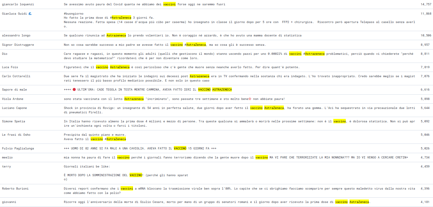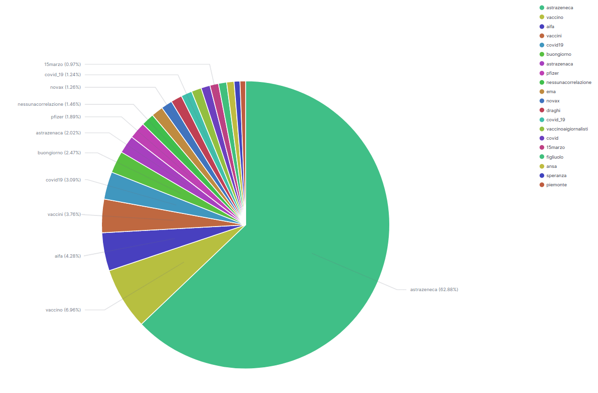 La classifica degli argomenti più utilizzati va per la maggiore ad AstraZeneca consequenzialmente alla ricerca effettuata. Vaccino e vaccini stringono nella morsa la parola aifa. In classifica una nutrita percentuale di persone che hanno condiviso l’hashtag sbagliato #astrazenaca ed emergono in fondo parole #novax e #nessunacorrelazione. Proprio quest’ultimo rappresenta la parola in codice utilizzata per ironizzare sulle prime risposte rassicuranti date dalle Big Pharma smentite, nel caso del vaccino anglosvedese, in seguito alle rigide disposizioni prese dall’Europa.