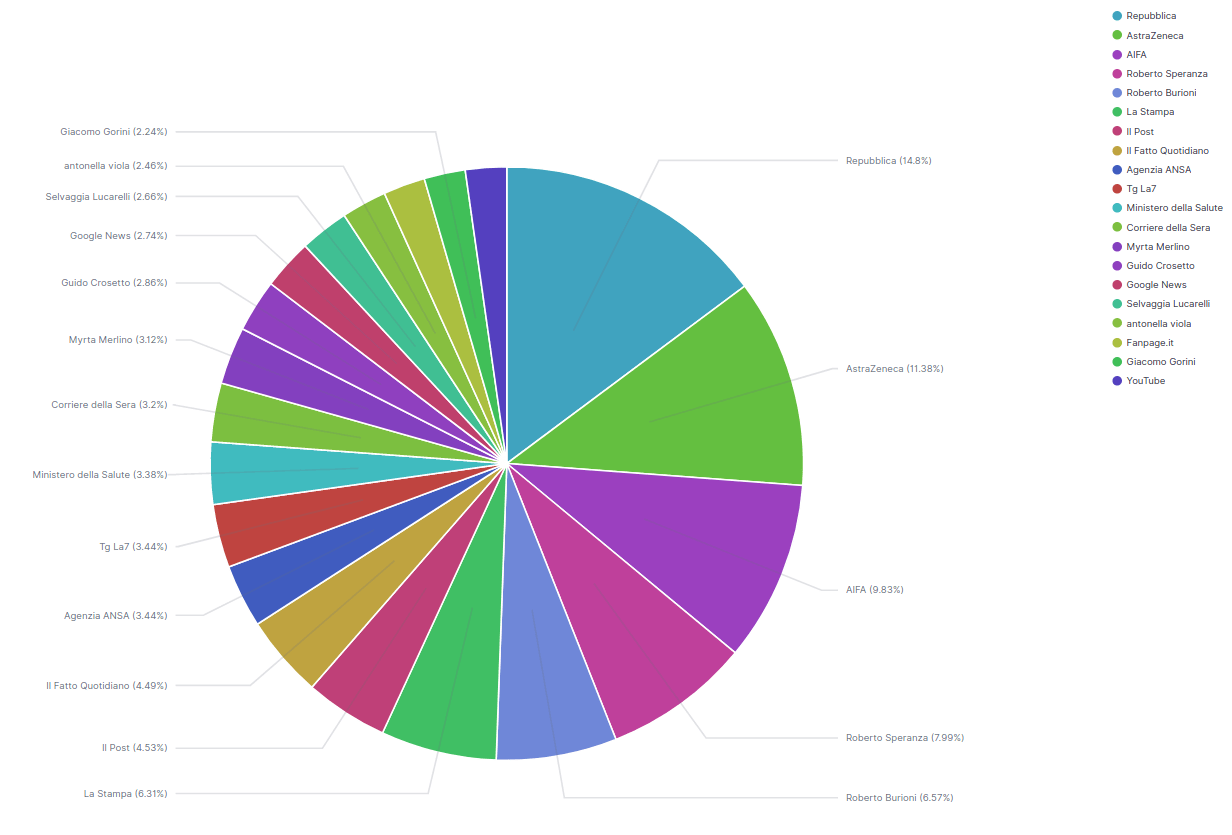 Il data journalist e scrittore, Livio Varriale, ha analizzato i contenuti pubblicati su Twitter aventi come riferimento l’hashtag #astrazeneca dall’11 al 16 marzo 2018 ed il risultato restituito è stato di 296.000 tweets a livello globale. Sul solo territorio nazionale, invece, si sono registrati 40.829 tweets, 835.163 mi piace, 166.164 condivisioni, 24.925 citazioni e 80.642 commenti.