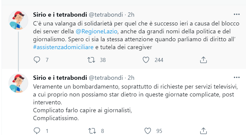 Grazie ai grandissimi geni 💩che hanno fatto l’attacco #hacker alla @RegioneLazio oggi mio padre è andato a prendere tutta la fornitura di alimenti, sonde e siringhe e non si è riusciti a concludere nulla. Una giornata buttata: persone con #disabilità e caregivers ringraziano! pic.twitter.com/DpSqolYCiR