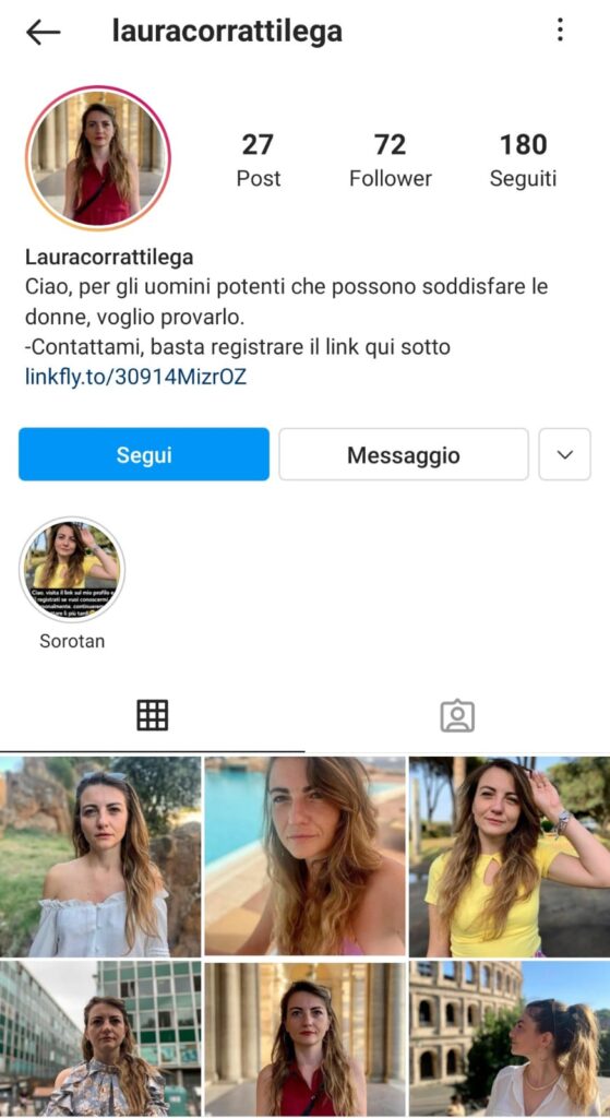 Stupore e sorpresa per gli utenti e sostenitori di Laura Corrotti, la consigliera regionale della Lega. Nella mattina di oggi diversi contenuti “hard” sono stati pubblicati su un profilo Istagram che riportava il suo nome. Poteva sembrare un gesto riconducibile alla leghista, ma un particolare ha scongiurato ipotesi e illazioni che avrebbero pesato sulla figura politica di Corrotti, facendo scattare l’allarme di un profilo fake: una sola vocale sbagliata nel nickname (lauracarrattilega). E poi la descrizione: “Ciao, per gli uomini potenti che possono soddisfare le donne, voglio provarlo. Contattami”, si legge sul contatto falso. Scrollando il profilo, diverse foto della politica ritratta in momenti istituzionali e privati. A distanza di poche ore, i follower hanno superato la soglia di 70 utenti.