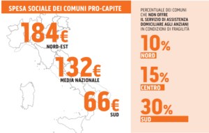 Il quadro attuale è già particolarmente drammatico: secondo Istat, ad esempio, la spesa sociale dei Comuni del Sud, pari a 66 euro pro-capite, è la metà rispetto alla media nazionale e poco più di un terzo rispetto al Nord-Est (184 euro). Quasi il 30% dei Comuni del Mezzogiorno, inoltre, non offre il servizio di assistenza domiciliare agli anziani in condizioni di fragilità, mentre al Centro i Comuni che non lo fanno sono meno del 15% e al Nord sono meno del 10%. La spesa pro-capite media al Sud è al di sotto del dato nazionale anche per quanto riguarda i minori, le persone con disabilità o a rischio di esclusione sociale.