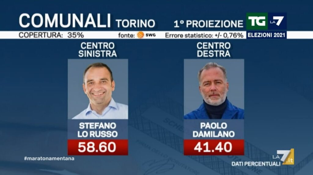 ORE 15:50 – Prima proiezione di Swg per La7 su Torino con una ampia copertura, il 35 per cento. Stefano Lo Russo è ormai certo di diventare primo cittadino: l’esponente Dem è al 58,6%, molto più staccato l’imprenditore Damilano, candidato del centrodestra, fermo al 41,4 per cento.