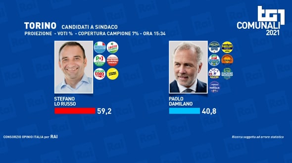 ORE 15:41 – Proiezione su campione del 7% di Consorzio Opinio per Rai: Lo Russo al 59,2% e Damilano al 40,8%.