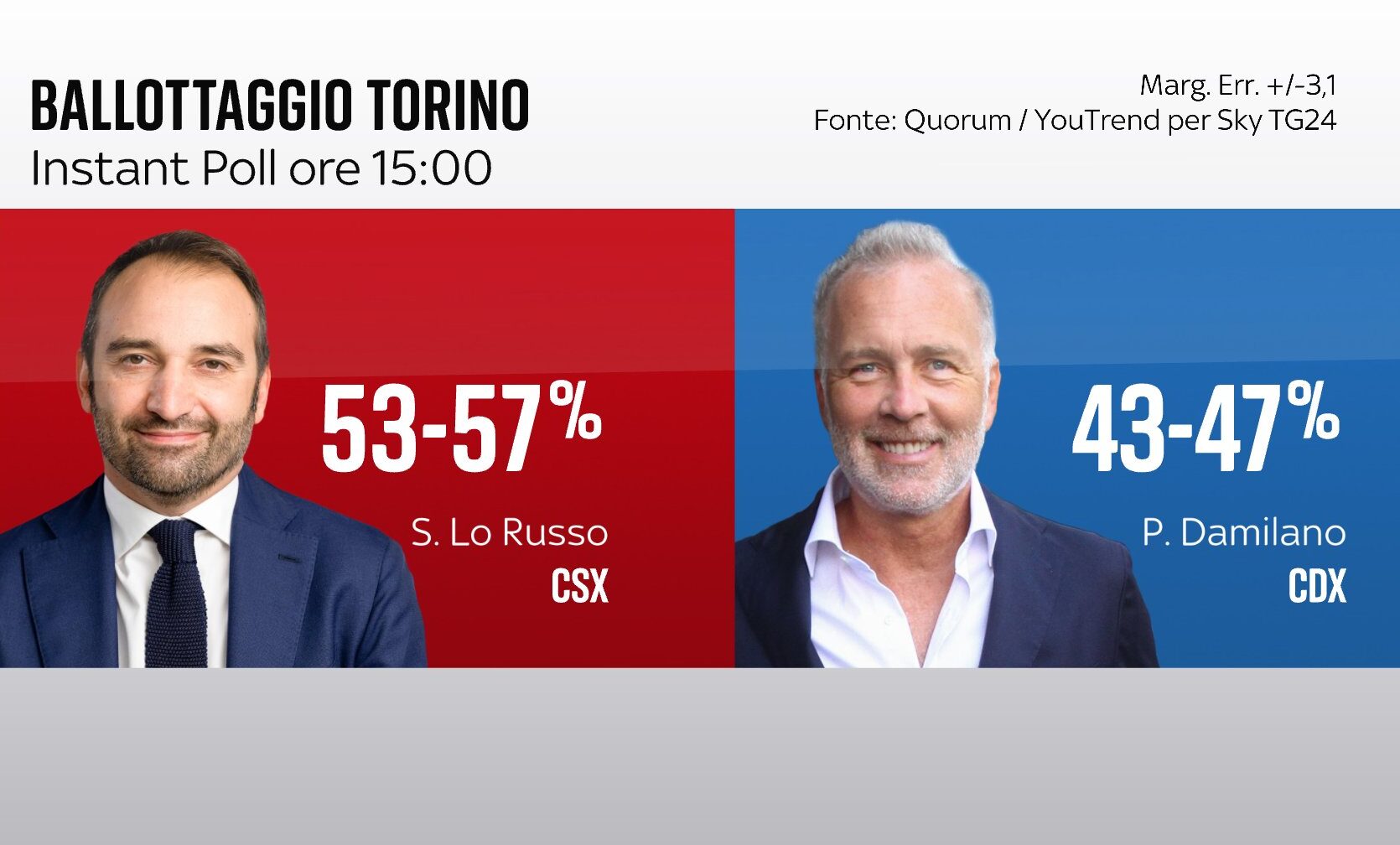 ORE 15:00 – I primi Instant poll Quorum/Youtrend per SkyTg24. Lo Russo (CSX) al 53-57% e Damilano (CDX) al 43-47%.