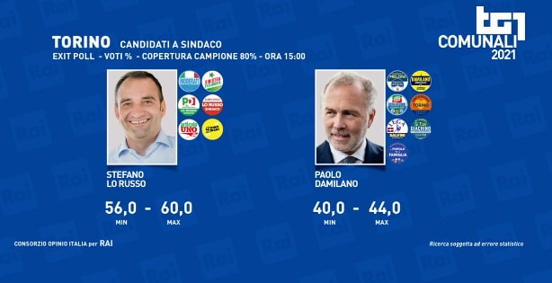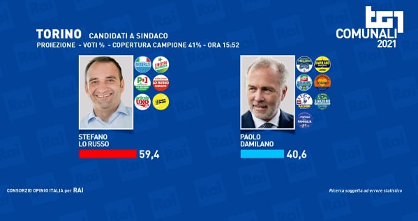 ORE 16:03 – Proiezione Consorzio Opinio per Rai: Lo Russo al 59,4% e Damilano al 40,6%.