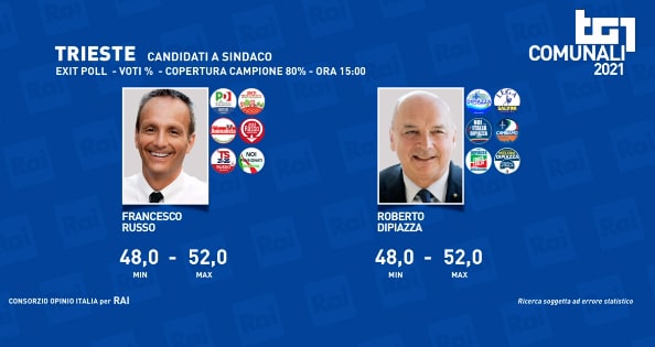 Ore 15 .00 – In base al primo Exit poll del consorzio Opinio Italia per la Rai, al ballottaggio per le comunali di Trieste, Roberto Dipiazza (centrodestra) e Francesco Russo (centrosinistra) si attestano entrambi tra il 48 e il 52. L’esito delle elezioni è ancora incerto.