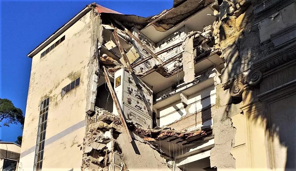 Accade nel primo pomeriggio, quando una facciata della Congrega della Resurrezione, con i loculi marmorei, viene giù. Il cedimento si verifica all’altezza del cancello Balestrieri, a poca distanza dall’ingresso del forno crematorio di via Santa Maria del Pianto. Il cedimento interessa un edificio di tre piani che si trova in una zona diametralmente opposta a quelle dove a gennaio scorso crollarono le cappelle di San Gioacchino e dei Dottori bianchi, un dettaglio che rende tutto ancora più allarmante. Le bare nella cappella della Resurrezione ora sono a vista, alcune sono inclinate su una base non più solida, in bilico, sospese. Scatta un nuovo allarme.