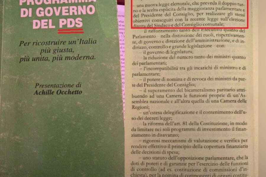 È lo stesso Renzi a ricordare il programma del Partito Democratico della Sinistra datato 1994 che infatti proponeva “una nuova legge elettorale, che preveda il doppio turno e la scelta esplicita della maggioranza parlamentare e del Presidente del Consiglio, per realizzare gli stessi obiettivi conseguiti con la recente legge sull’elezione DIRETTA del Sindaco e del Consiglio comunale”. Tempo ne è passato da allora, ma le contraddizioni di certa sinistra rimangono sempre a galla.