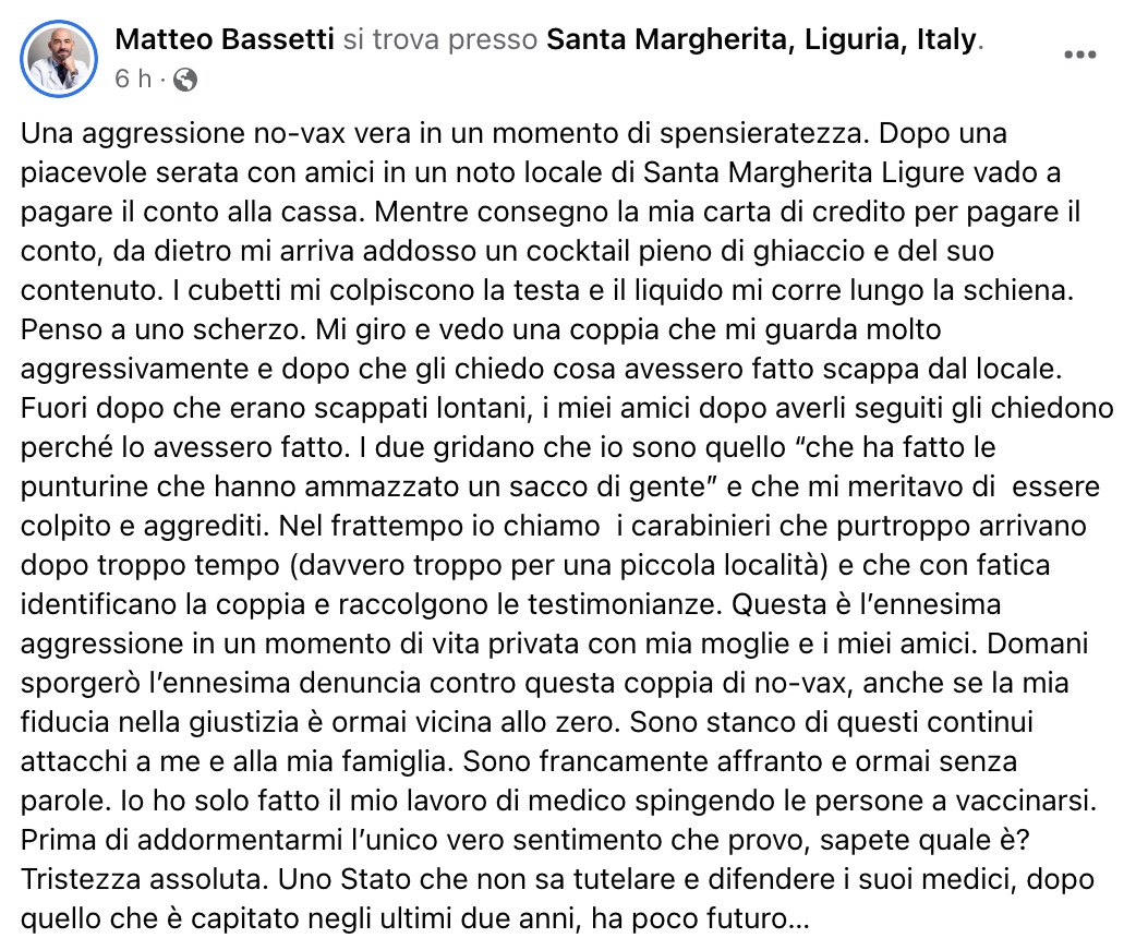 “Un’aggressione no-vax vera in un momento di spensieratezza – la definisce lo stesso Bassetti sui social -. Mentre consegno la mia carta di credito per pagare il conto, da dietro mi arriva addosso un cocktail pieno di ghiaccio e del suo contenuto. I cubetti mi colpiscono la testa e il liquido mi corre lungo la schiena. Penso a uno scherzo. Mi giro e vedo una coppia che mi guarda molto aggressivamente e dopo che gli chiedo cosa avessero fatto scappa dal locale. Fuori dopo che erano scappati lontani, i miei amici dopo averli seguiti chiedono loro perché lo avessero fatto. I due gridano che io sono quello ‘che ha fatto le punturine che hanno ammazzato un sacco di gente’ e che mi meritavo di essere colpito e aggredito”.
